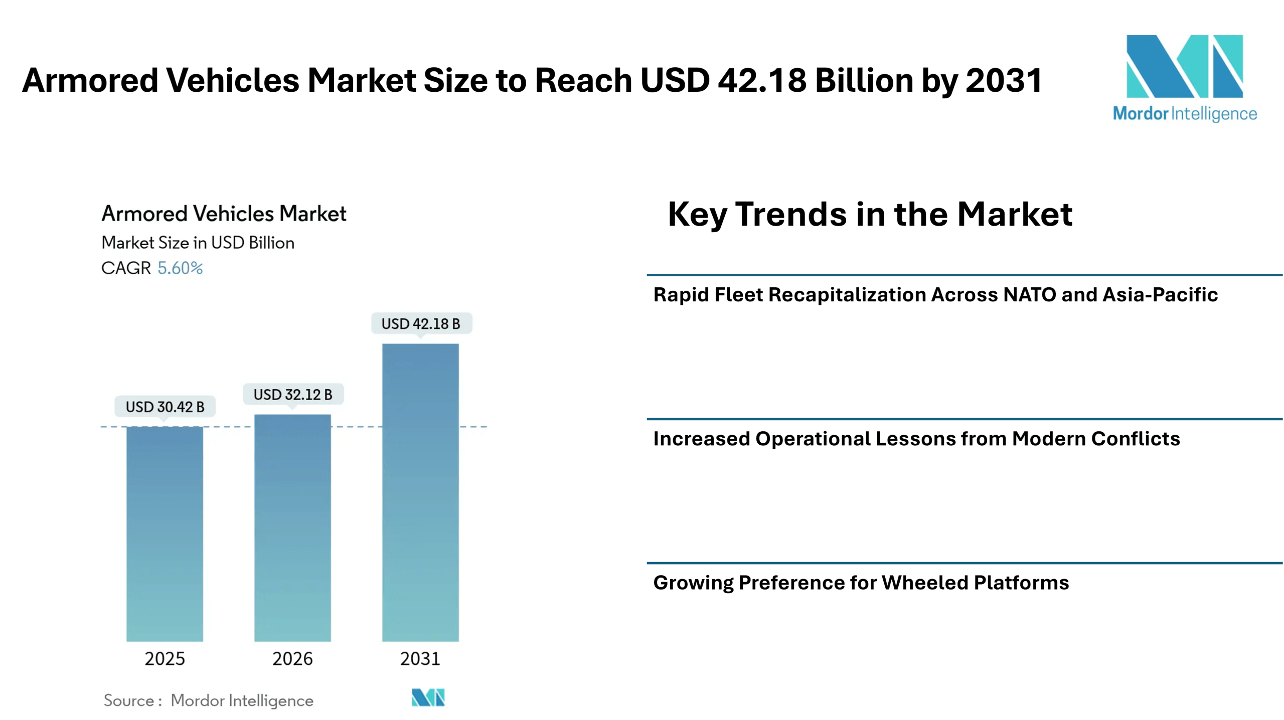 According to Mordor Intelligence, the armored vehicles market size is projected to grow from USD 30.42 billion in 2025 to USD 32.12 billion in 2026 and is expected to reach USD 42.18 billion by 2031, registering a CAGR of 5.6% during the forecast period. The armored vehicles industry is witnessing steady expansion as governments accelerate fleet replacement programs and strengthen land-force capabilities.