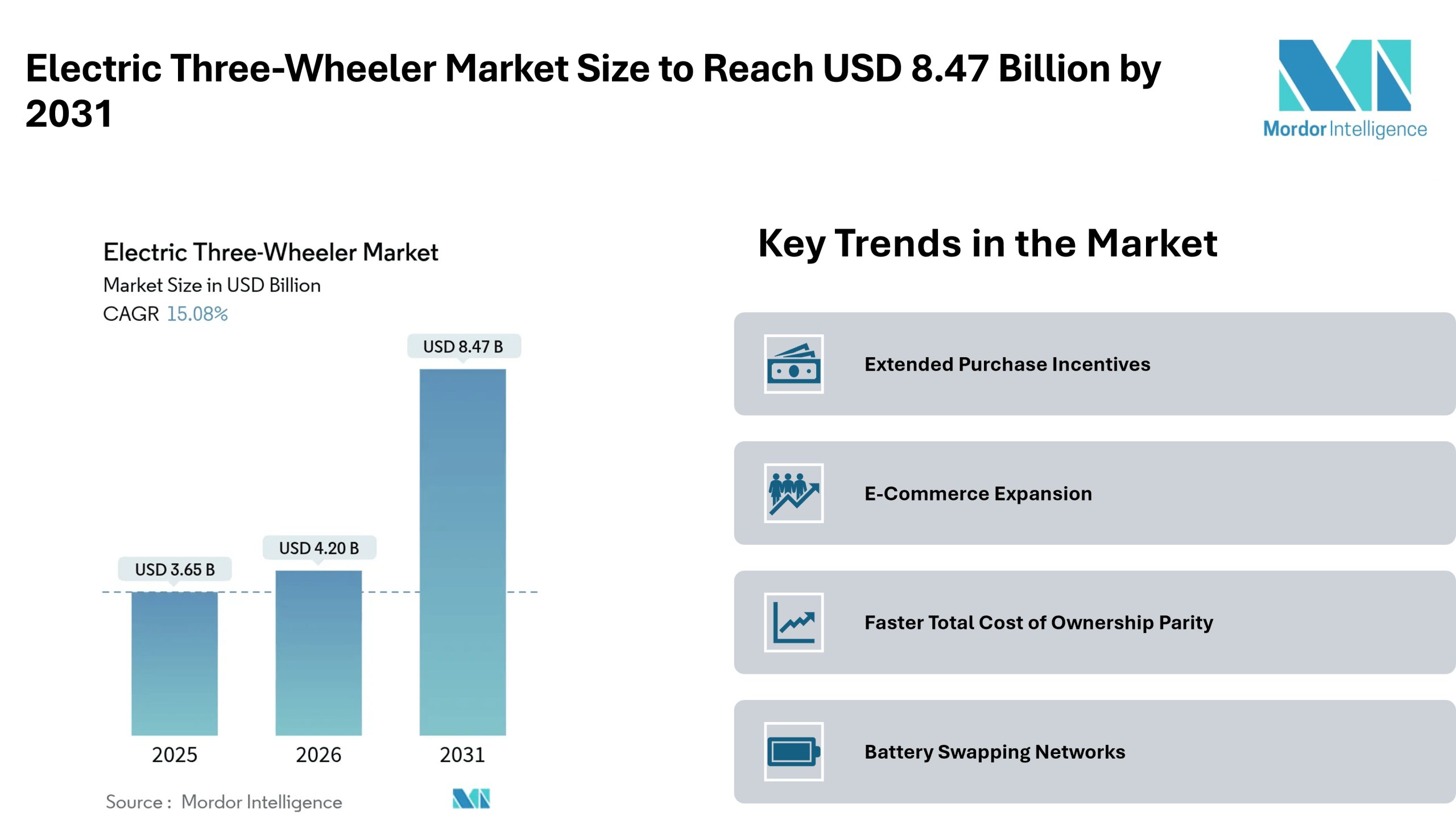 According to Mordor Intelligence, the electric three-wheeler market size was valued at USD 3.65 billion in 2025 and is estimated to grow from USD 4.2 billion in 2026 to reach USD 8.47 billion by 2031, registering a CAGR of 15.08% during the forecast period. The electric three-wheeler market forecast highlights rising demand across passenger and goods carrier applications, supported by policy support, improving battery economics, and expanding charging networks.