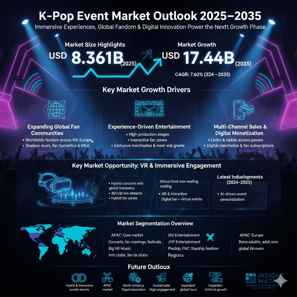 The K-Pop Event Market is on a rapid trajectory. Fueled by immersive technologies and a global fan economy that refuses to slow down, the market is forecast to expand from USD 8.361 billion in 2025 to USD 17.44 billion by 2035, representing a compound annual growth rate (CAGR) of 7.63% (2025–2035). This growth reflects more than just ticket sales: it captures revenue from hybrid live/virtual events, premium fan experiences, sponsorships, and a widening global footprint across multiple sales channels.