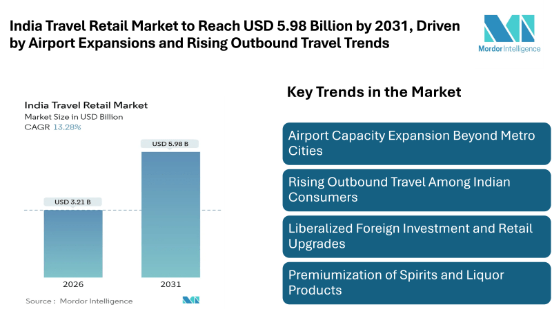 According to Mordor Intelligence, the India travel retail market was valued at USD 2.83 billion in 2025 and estimated to grow from USD 3.21 billion in 2026 to reach USD 5.98 billion by 2031, at a CAGR of 13.28%. Several factors are contributing to this expansion, including upgrades to airport infrastructure, increasing disposable income among the middle class, liberalized foreign investment regulations, and rising outbound travel by Indian consumers.