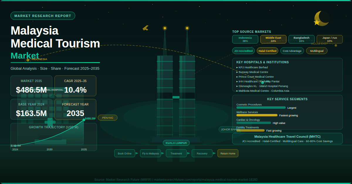 Pune, India — The Malaysia Medical Tourism Market is charting a confident and sustained growth trajectory, according to the latest Malaysia Medical Tourism Market report published by Market Research Future (MRFR). Valued at USD 163.5 million in 2024, the market is projected to grow from USD 180.54 million in 2025 to USD 486.5 million by 2035, representing a compound annual growth rate (CAGR) of 10.4% during the forecast period 2025 to 2035. This remarkable expansion cements Malaysia’s standing as one of Asia’s premier medical tourism destinations — a market that shares deep structural alignment with Longevity Market size dynamics globally, as aging populations across Southeast Asia, the Middle East, and South Asia increasingly seek affordable, high-quality healthcare solutions beyond their home countries.