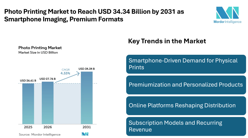 According to Mordor Intelligence, the global photo printing market size was valued at USD 26.61 billion in 2025 and is estimated at USD 27.76 billion in 2026, projected to reach USD 34.34 billion by 2031 at a CAGR of 4.33%. This steady expansion reflects sustained demand for physical photo products despite the dominance of digital storage. Consumers continue to convert digital memories into tangible keepsakes, supporting consistent growth across both consumer and professional segments. Three core factors support the positive market forecast. First, smartphone photography has become universal, dramatically increasing the volume of images captured daily. Second, consumers still value physical prints for gifting, décor, and archiving.