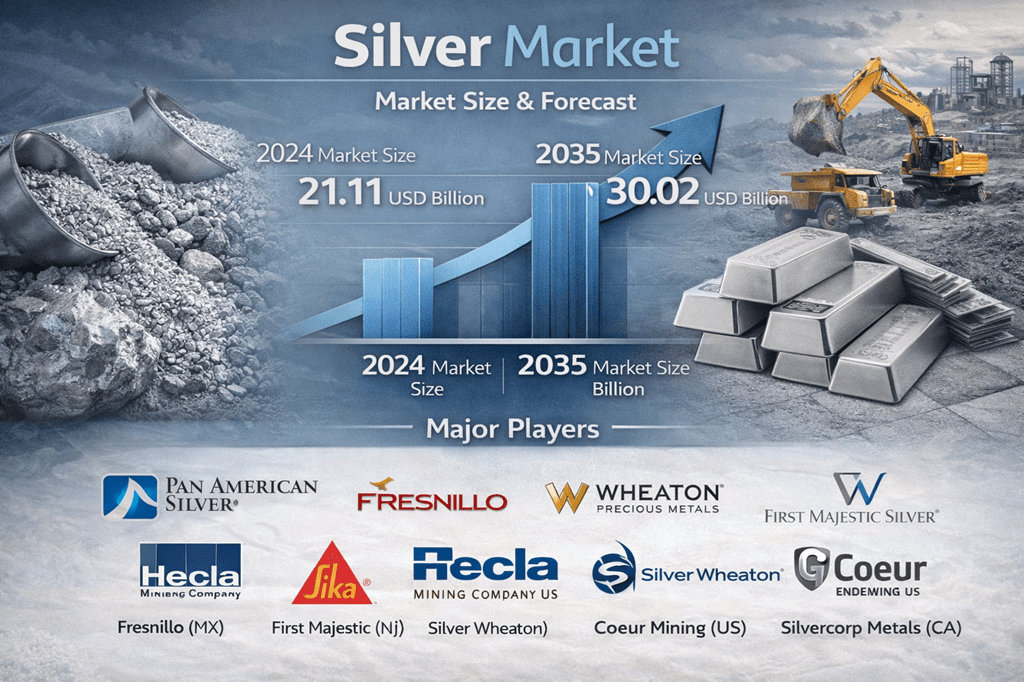 According to the global silver market was valued at USD 21.11 billion in 2024 and is projected to grow from USD 21.8 billion in 2025 to USD 30.02 billion by 2035, advancing at a compound annual growth rate (CAGR) of 3.25% during the forecast period from 2025 to 2035.