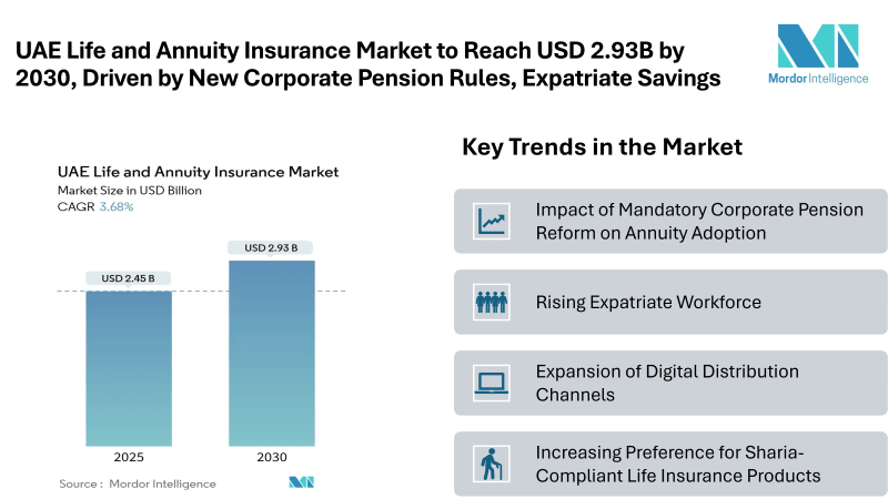 According to Mordor Intelligence, the UAE Life and Annuity Insurance Market size is valued at USD 2.45 billion in 2025 and is forecast to climb to USD 2.93 billion by 2030, reflecting a 3.68% CAGR. The market is further supported by expanding digital distribution channels, a range of Sharia-compliant products, and Dubai’s position as a leading financial hub.