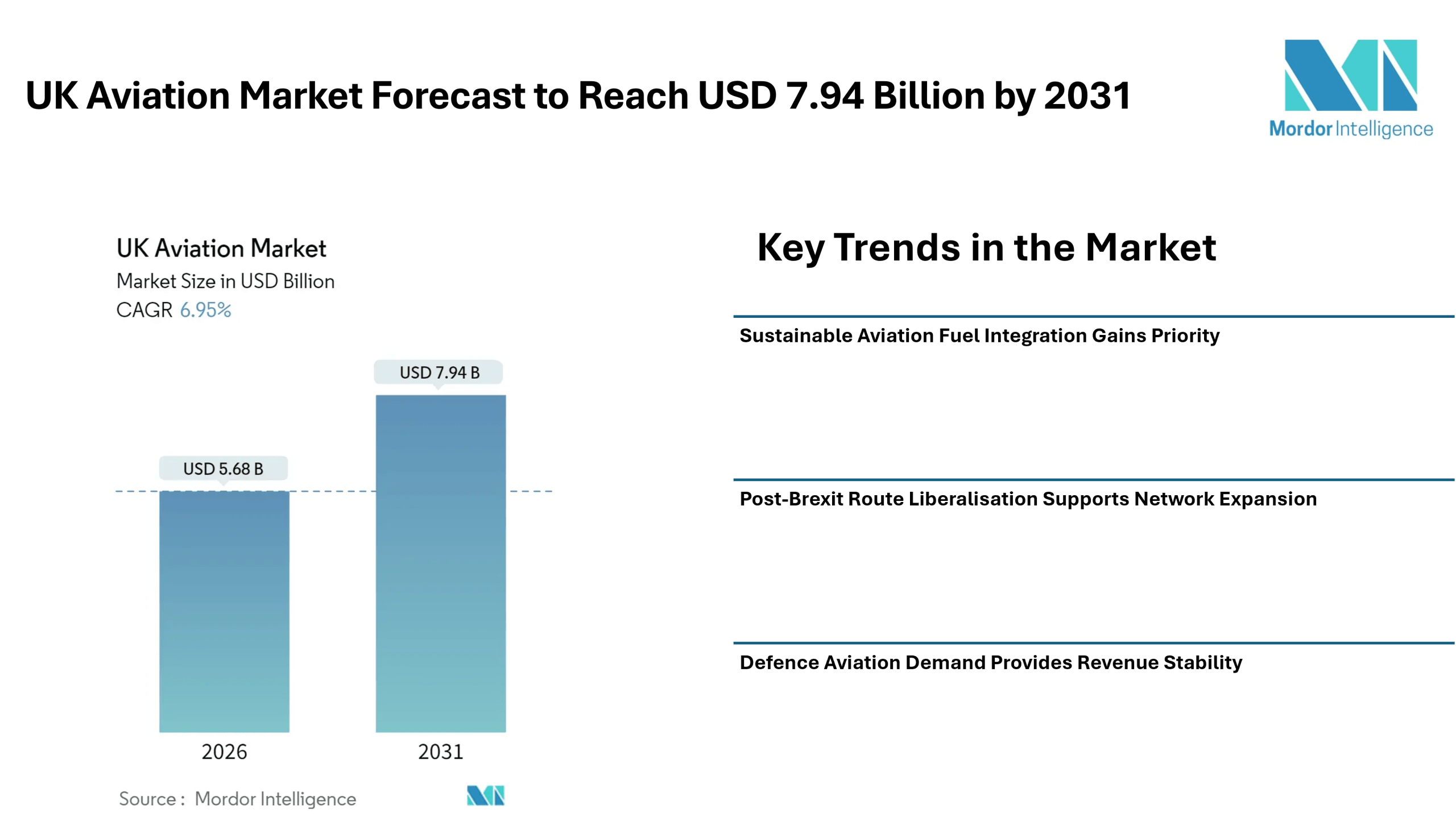 According to Mordor Intelligence, the UK aviation market size was valued at USD 5.68 billion in 2026 to USD 7.94 billion by 2031, reflecting a CAGR of 6.95% during the forecast period. This outlook underlines a balanced recovery supported by civil aviation demand, government defence spending, and policy-driven sustainability goals.